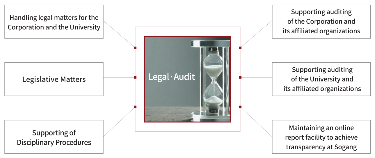 We handle the Legal Affairs of the Corporation including lawsuits, check and investigate compliance with the Decisions of the Board of Trustees, support auditing of the Corporation, reasonable business management and efficient budget management by the University and the Corporation and its Affiliated organizations.